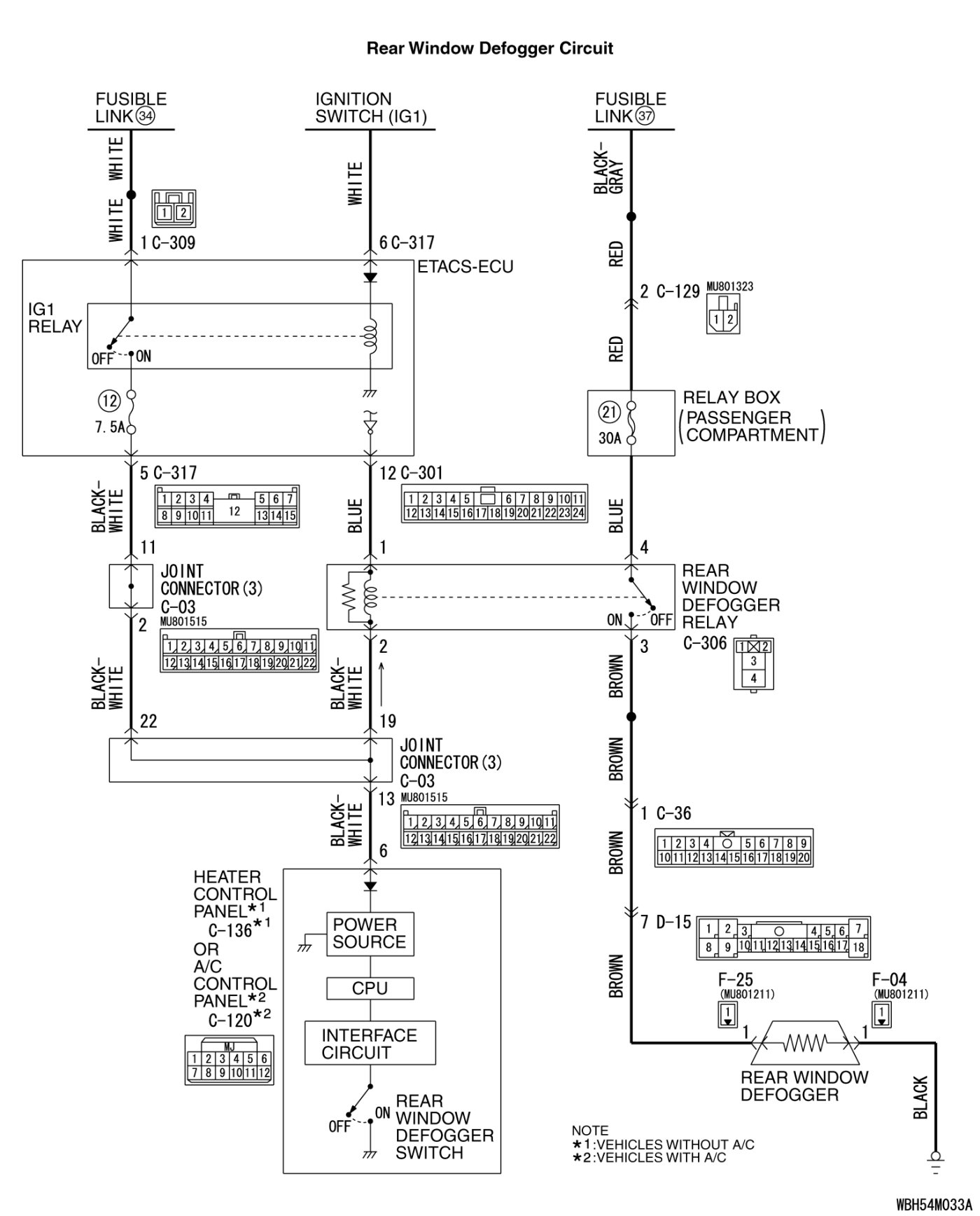 STEP 15. Check the wiring harness between rear window defogger relay connector C-306 (terminal 1) and ETACS-ECU C-301 (terminal 12).