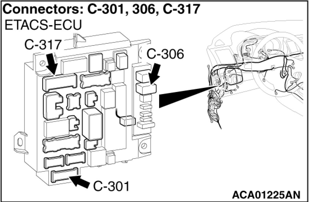 STEP 14. Check ETACS-ECU connector C-301 for loose, corroded or damaged terminals, or terminals pushed back in the connector.