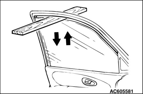 1. Place an approximately 10 mm (0.39 inch) thick wood board as shown. Then, close the door window glass by one-shot up action of the power window switch.