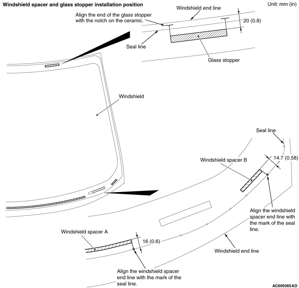 Install the windshield spacer and glass stoppers to the specified positions so that there are no adrift or warped surfaces inside the windshield glass.