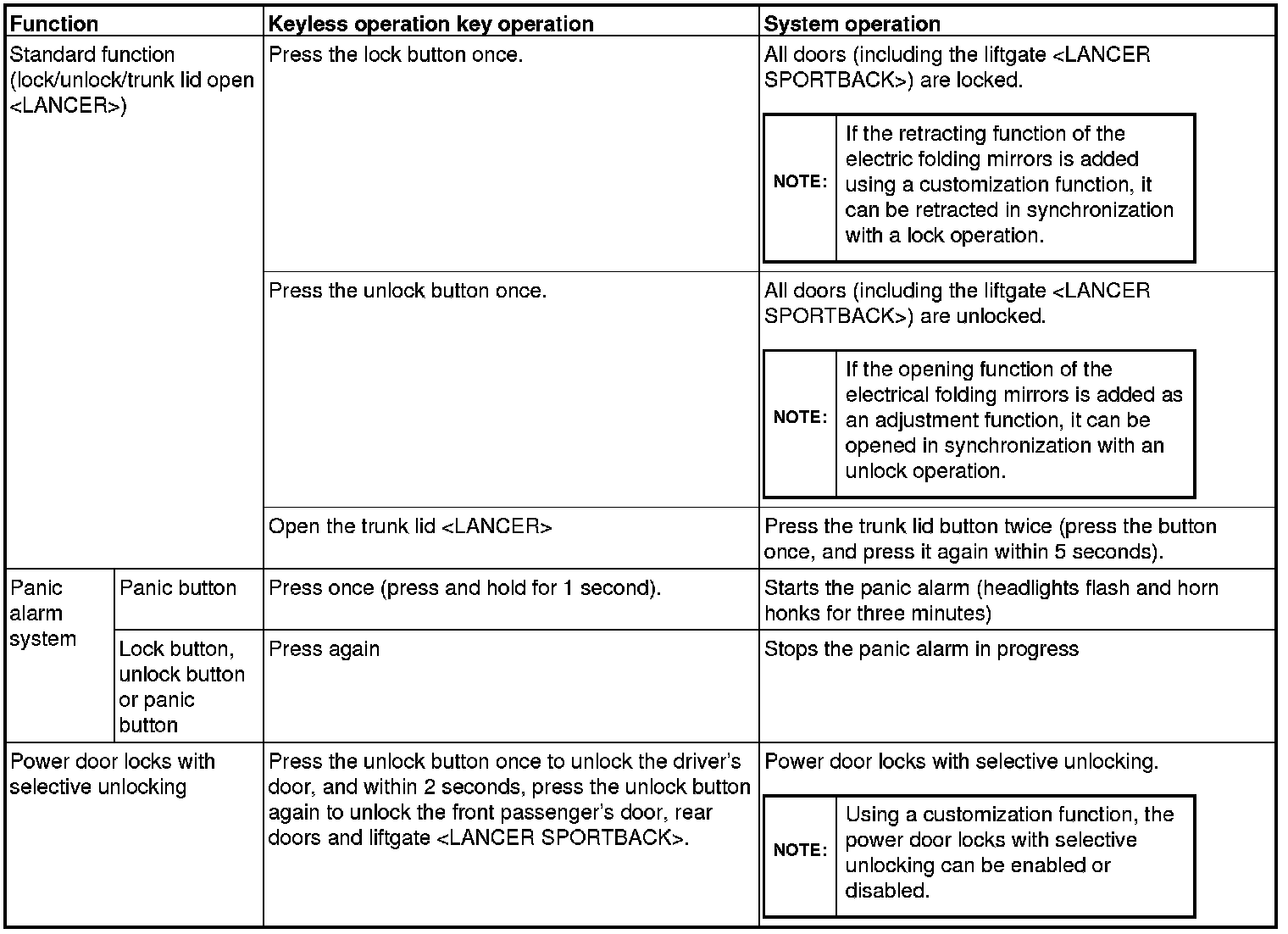 - When the lock/unlock switch of door outside handle (driver's side) is pressed once, only the driver's door is unlocked. When the lock/unlock switch of door outside handle (driver's side) is pressed once again within 2 seconds after the driver's door is unlocked, the front passenger's door, rear doors, and the liftgate [LANCER SPORTBACK] are unlocked.
