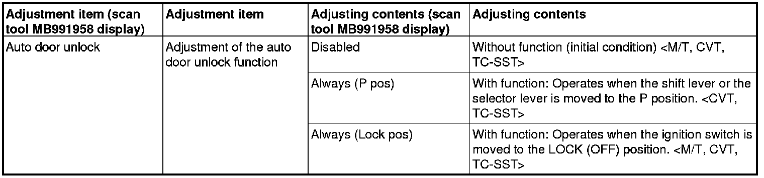 By operating the ETACS system or MMCS of scan tool MB991958, the following functions can be programmed. The programmed information is held even when the battery is disconnected.