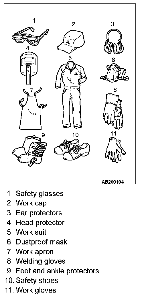 During body repair work, a work suit, a work cap, and safety shoes should be worn at all times. Depending on the work being done, safety glasses, gloves, ear protectors, a dust proof mask, etc., should also be worn as needed.