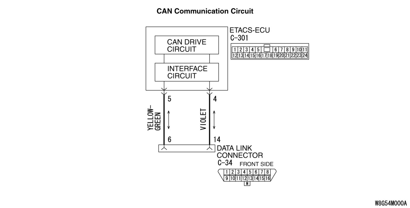 - Malfunction of the wiring harness (open circuit, short to ground, short to power supply between the data link connector and the ETACS-ECU connector, line-to-line short, or power supply to the ETACS-ECU)