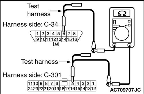 (1)Disconnect the scan tool and ETACS-ECU connector C-301, and measure the resistance at the wiring harness side of data link connector C-34.