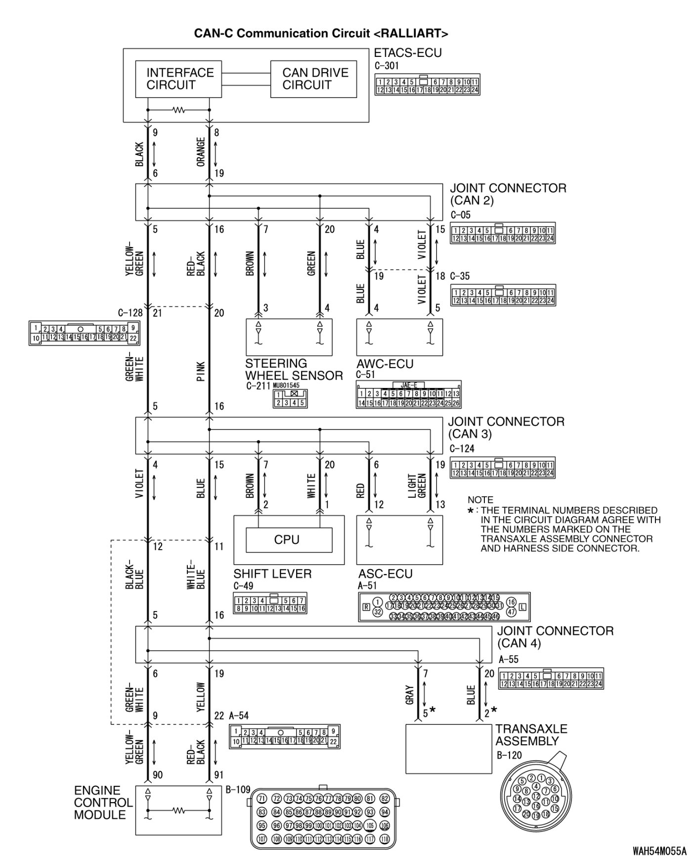 (5)Check the wiring harness between joint connector (CAN4) A-55 (terminal 19) and ECM connector B-109 (terminal 91) [RALLIART]
