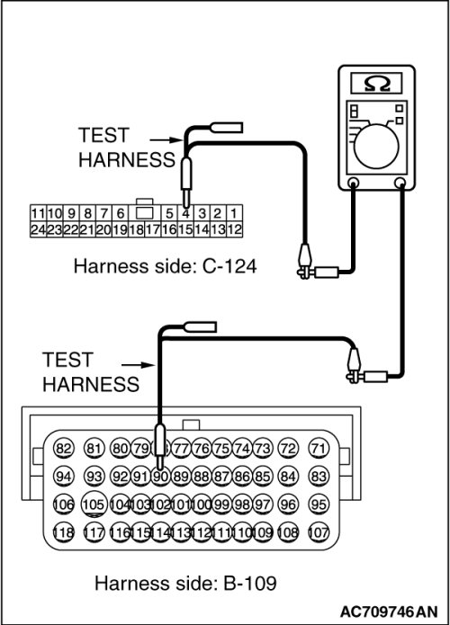 (2)Check the wiring harness between joint connector (CAN3) C-124 (terminal 4) and ECM connector B-109 (terminal 90) [except RALLIART]