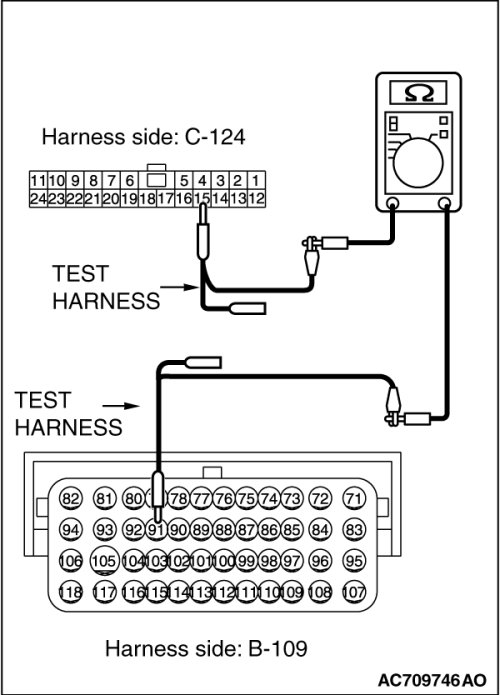 (1)Disconnect joint connector (CAN3) C-124 [except RALLIART] or joint connector (CAN4) A-55 [RALLIART] and ECM connector B-109, and check the wiring harness.