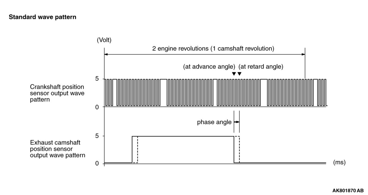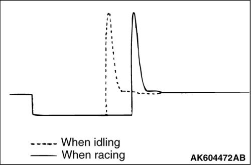 - Verify that the relative position of the exhaust camshaft position sensor's output wave changes when the low load operation changes to the high load operation.