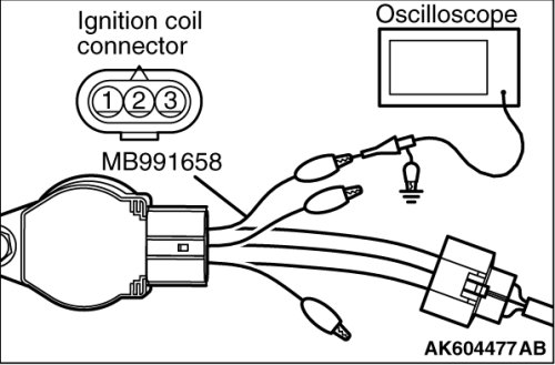 9. Disconnect the ignition coil connector, and connect test harness special tool (MB991658) between the separated connector. (All terminals should be connected.)