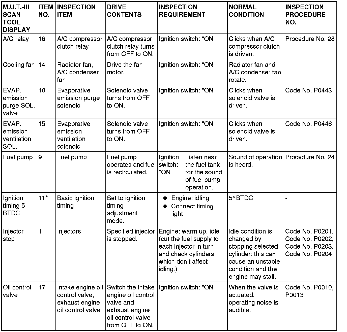 ACTUATOR TEST REFERENCE TABLE