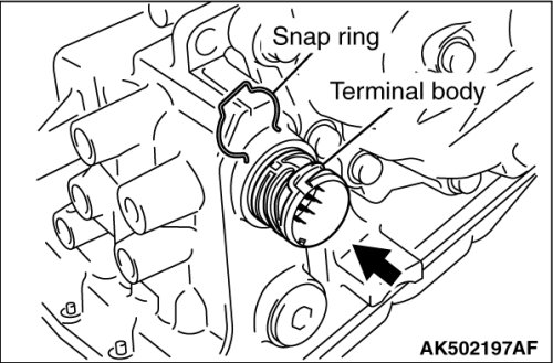 Remove the snap ring from the terminal body, and press the terminal body into the transaxle case.