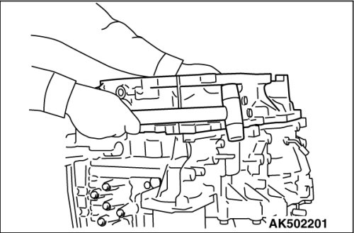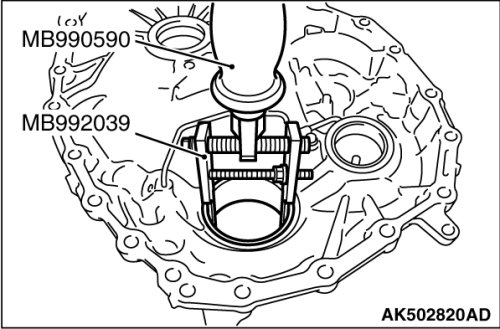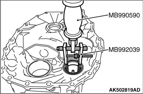 19. Using the special tools MB990590 and MB992039, remove the outer race of differential side bearing from the converter housing.