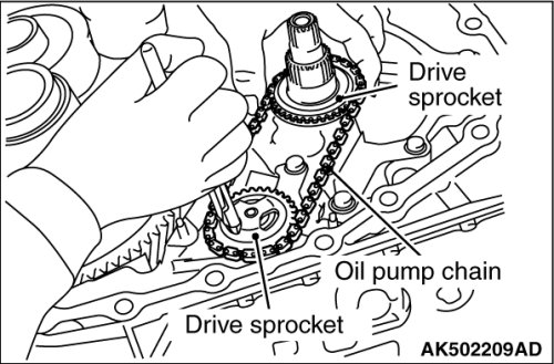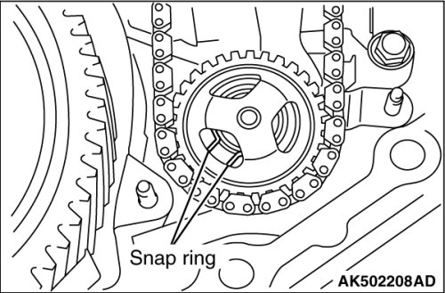 28. Expand the snap ring, and remove the driven sprocket, oil pump chain, and drive sprocket.