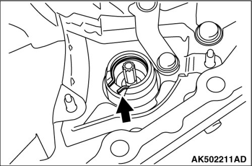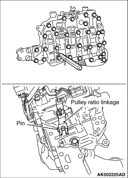 (1) Insert pins etc. (dia. 3 mm (0.12 in)) into linkage stopper holes of the control valve assembly to fix the pulley ratio linkage.