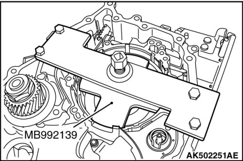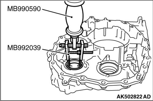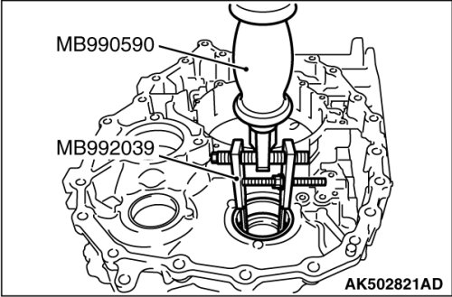 53. Using the special tools MB990590 and MB992039, remove outer race of the differential side bearing from the transaxle case.