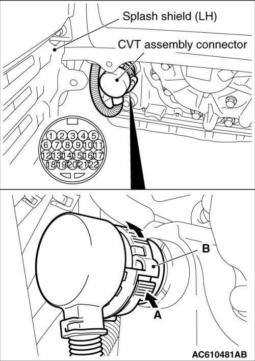 1. While pressing A in the figure, turn B counterclockwise to unlock the CVT assembly connector, and disconnect the connector.