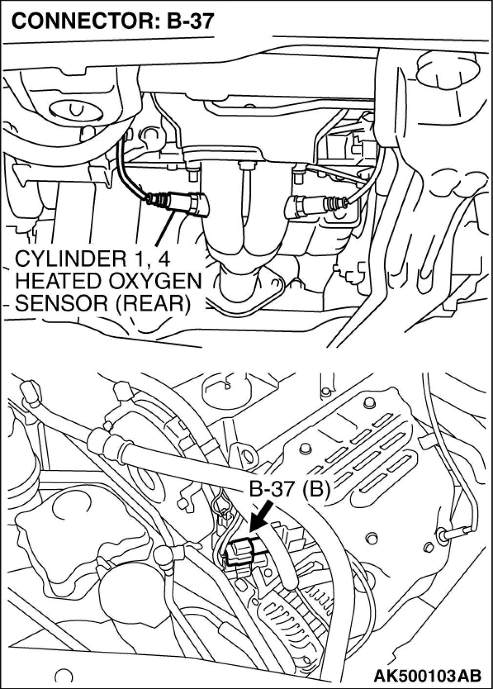 STEP 1. Check harness connector B-37 at cylinder 1, 4 heated oxygen sensor (rear) and harness connector B-21 at ECM [M/T]
