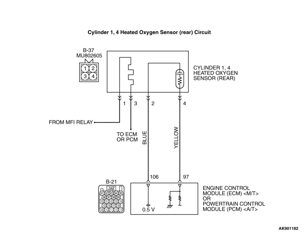 - The ECM[ M/T] or the PCM[ A/T] applies an offset voltage of 0.5 volt to terminal No. 2 of the cylinder 1, 4 heated oxygen sensor (rear).