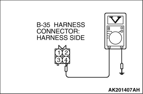 (1)Disconnect the cylinder 2, 3 heated oxygen sensor (front) connector B-35 and connect test harness special tool MB991316, to the connector on the cylinder 2, 3 heated oxygen sensor (front) side.