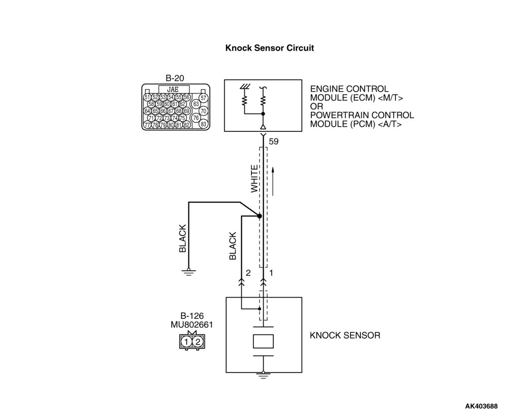- The knock sensor sends a signal voltage to the ECM[ M/T] or the PCM[ A/T] (terminal No. 59).