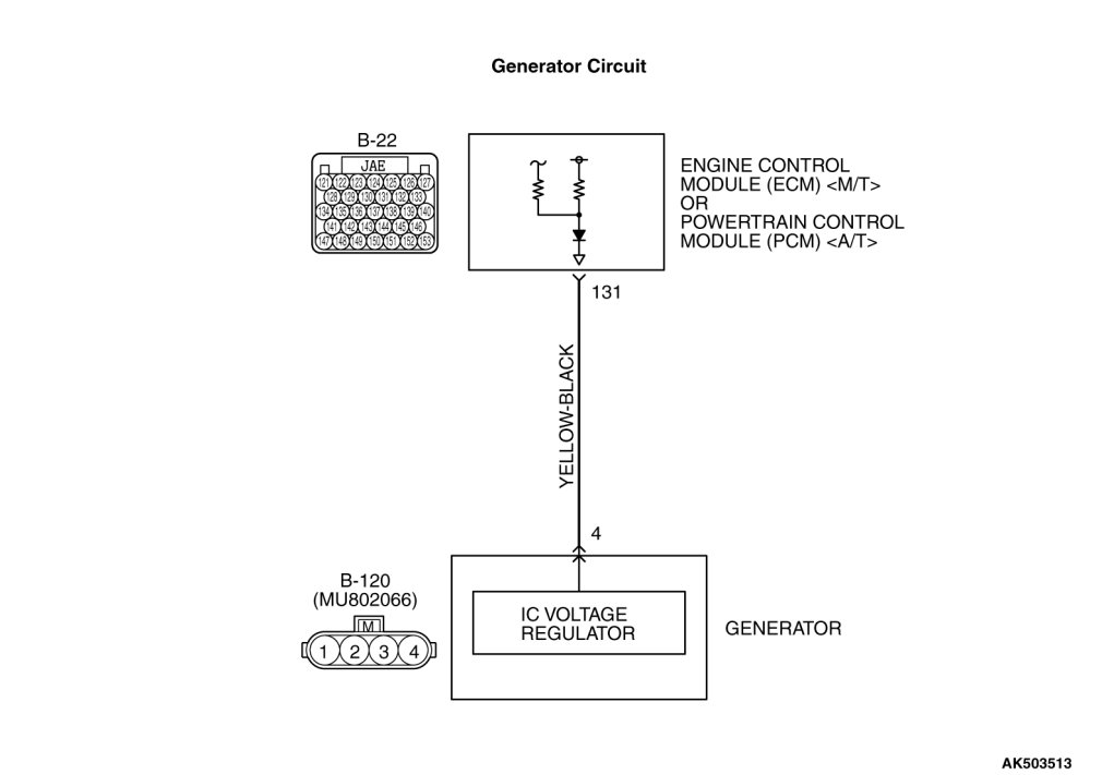 - The ECM[ M/T] or the PCM[ A/T] (terminal No. 131) apply a battery voltage into the generator FR terminal No. 4 via resistance inside the unit.