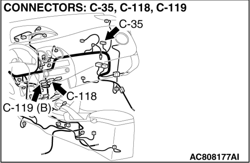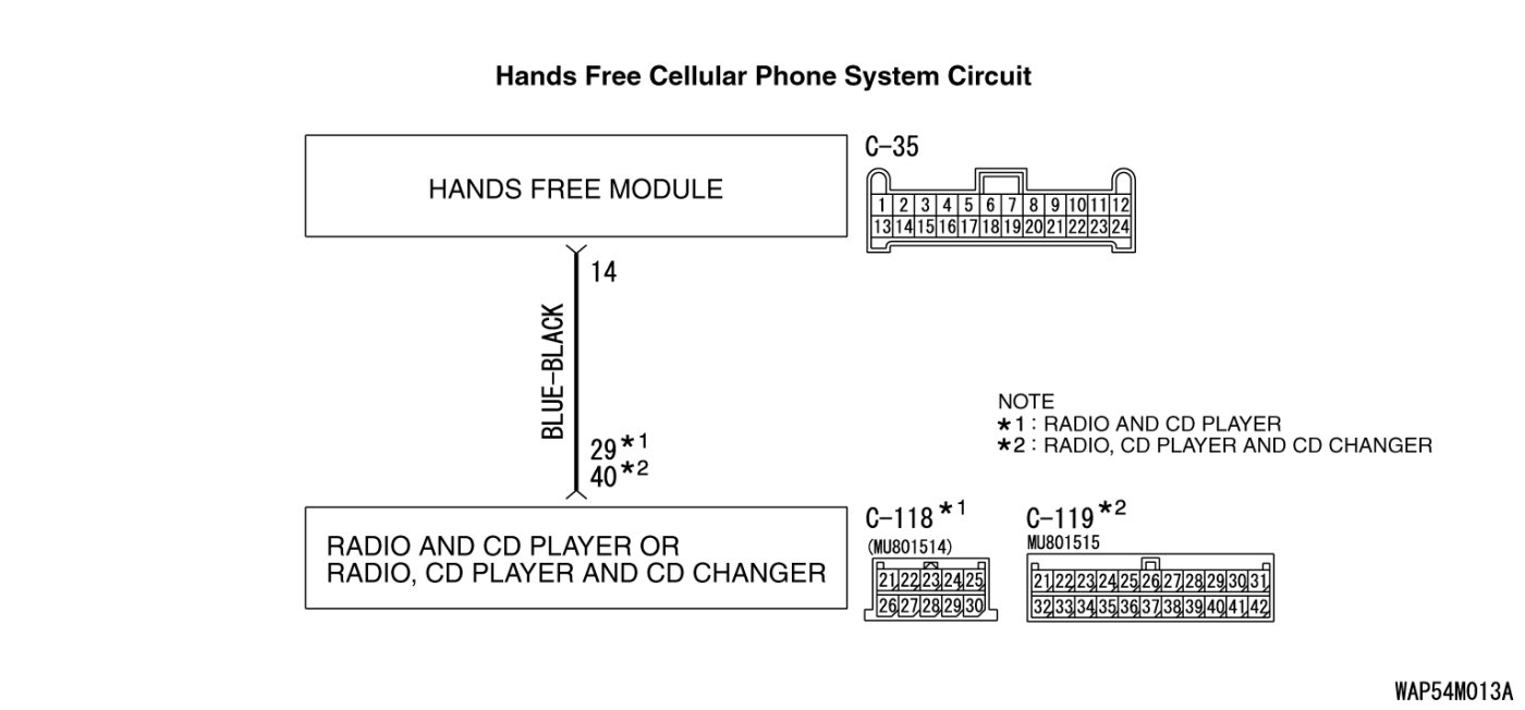 STEP 3. Check the wiring harness between radio and CD player C-118 (terminal 29) or radio, CD player and CD changer C-119 (terminal 40) and hands free module connector C-35 (terminal 14).