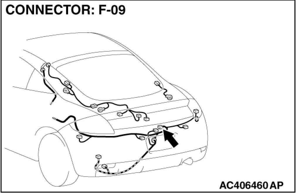 STEP 1. Check liftgate latch switch connector F-09 for loose, corroded or damaged terminals, or terminals pushed back in the connector.