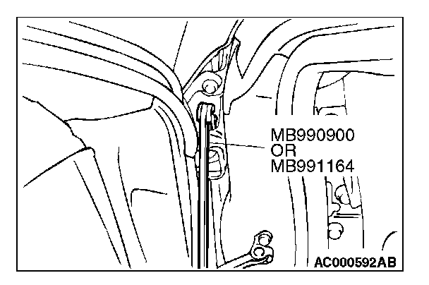 1. Use special tool MB990900 or MB991164 to loosen the hinge mounting bolts on the body side, and then adjust the clearance around the door so that it is uniform on all sides.