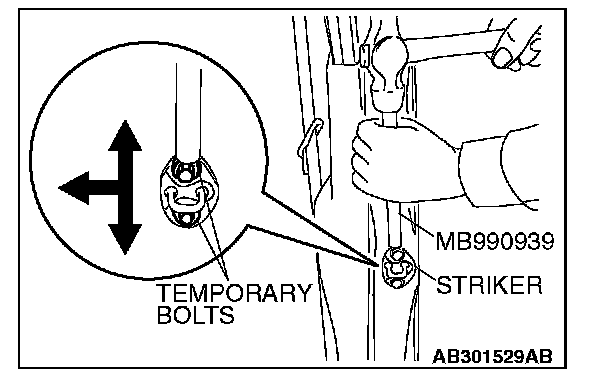 Install an temporary bolts instead of the striker mounting bolt, and use special tool MB990939 and a hammer to tap the bolt in the desired direction.