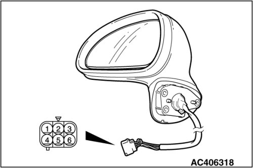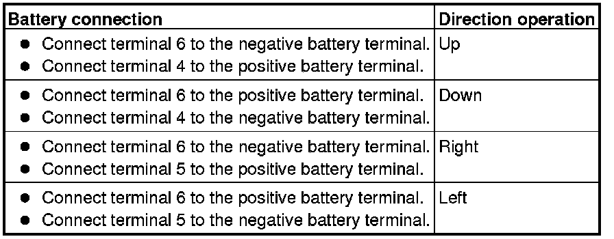 Check that the mirror moves as described in the table when each terminal is connected to the battery.