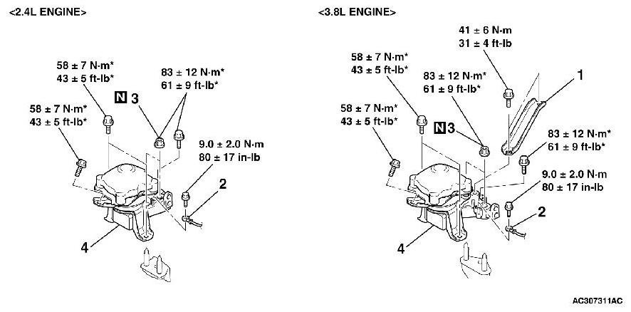 *: Indicates parts which should be initially tightened, and then fully tightened after placing the vehicle horizontally and loading the full weight of the engine on the vehicle body.