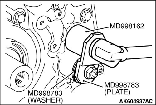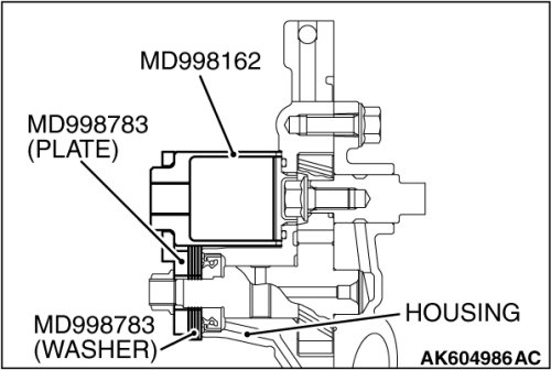 4. Set the special tool, Plug Retainer (MD998783), pushing it slightly. Place the washer to fit the clearance between Plug Retainer and the housing.