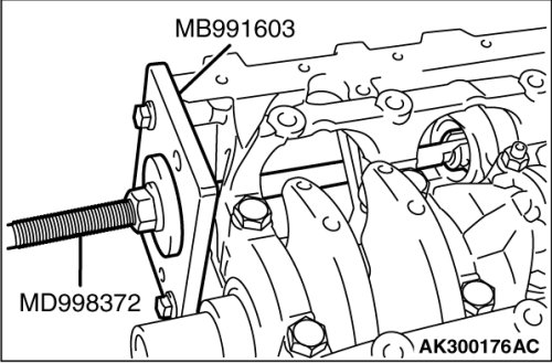 1. Install special tools MB991603 and MD998372 in front of the cylinder block when removing the left counterbalance shaft rear bearing.