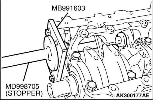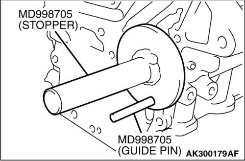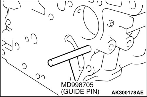 1. Install the guide pin of special tool MD998705 in the threaded hole of the cylinder block as shown.