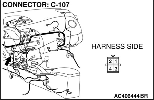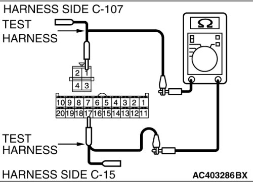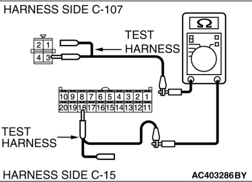 (1)Disconnect A/C-ECU connector C-15 and power transistor connector C-107, and measure the resistance at the wiring harness side.