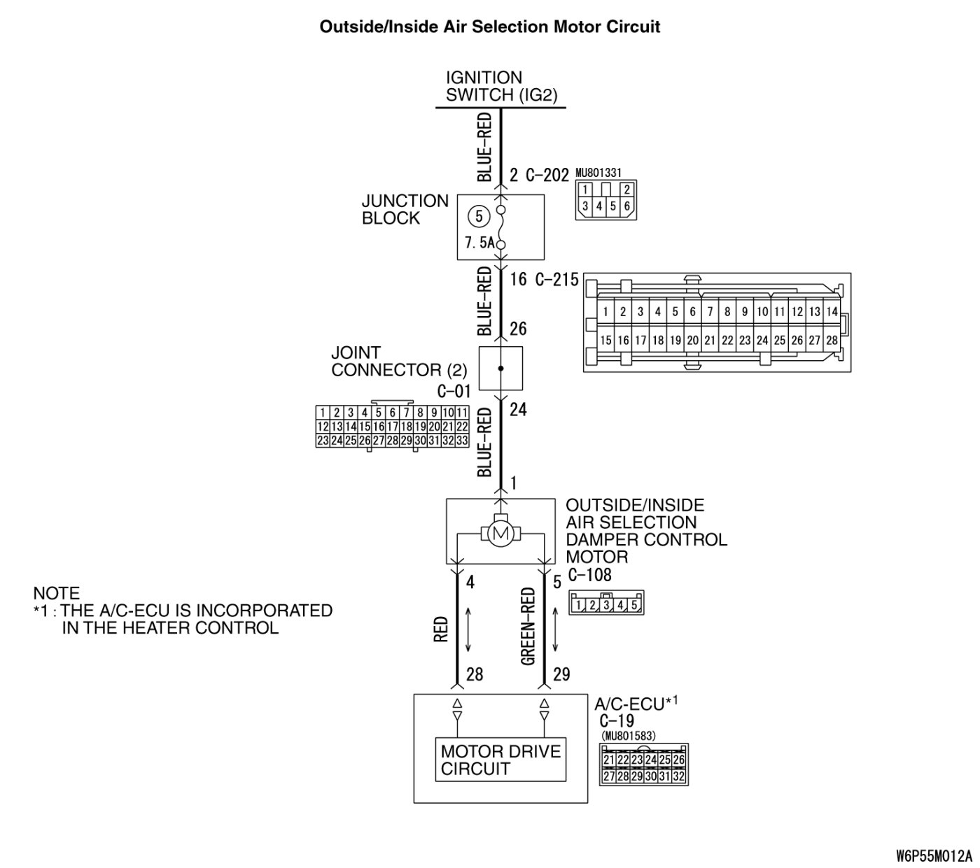 - Malfunction of the harness (outside/inside air selection damper control motor circuit is open/shorted to ground)