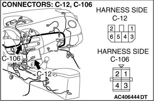 STEP 7. Check the wiring harness for open circuit blower switch connector C-12 (terminals 1, 6 and 2) and resistor connector C-106 (terminals 3, 1 and 4).