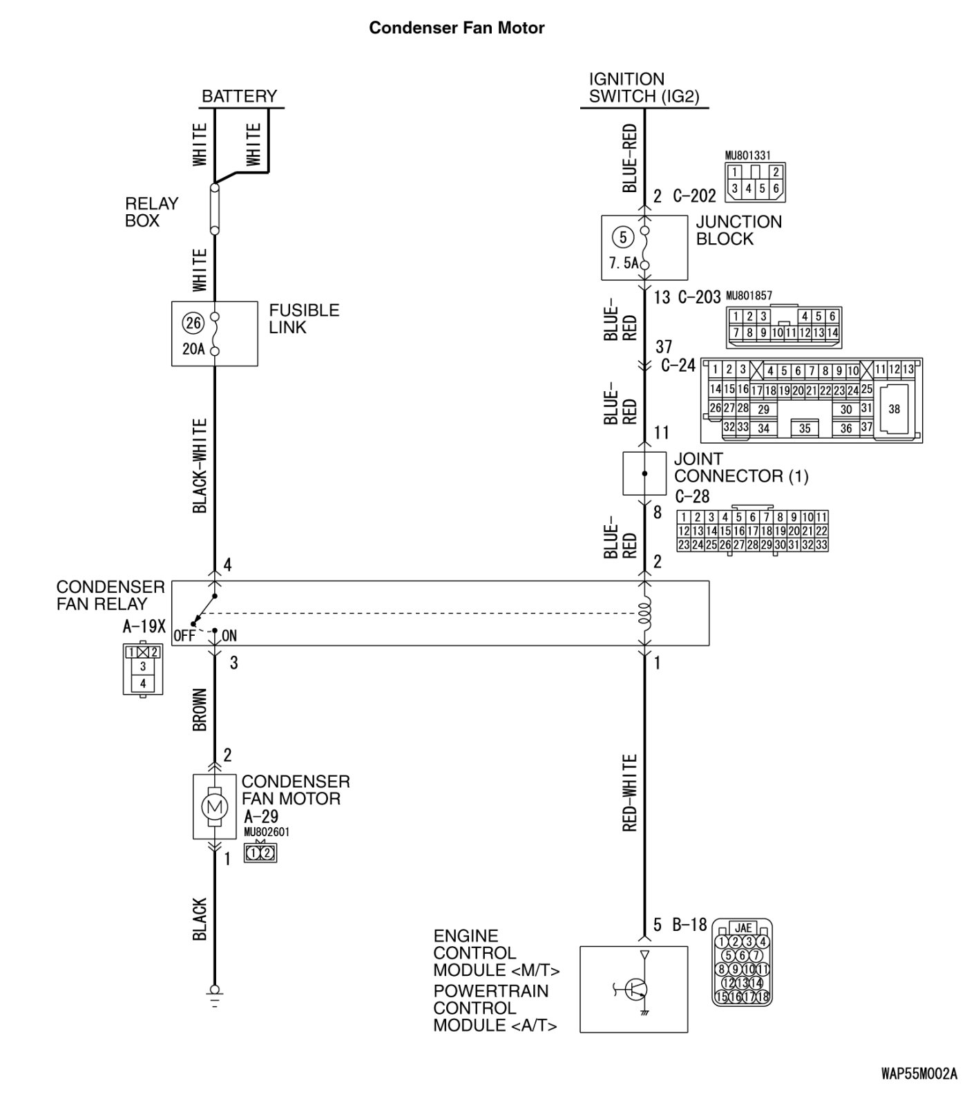 (1)Disconnect condenser fan relay connector A-19X, and measure the voltage at the junction block side.