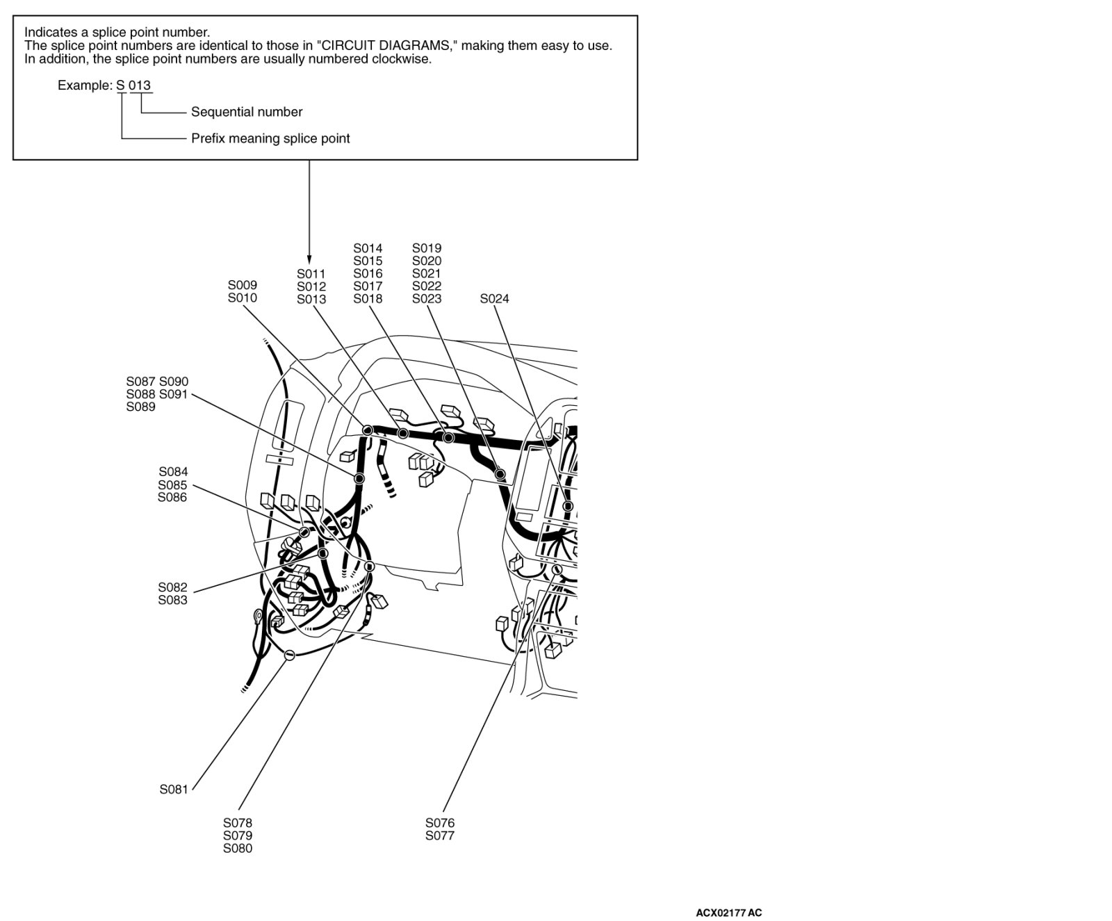 "Splice locations" describes splice points of each wiring harness on an actual vehicle. Some variations are included in one splice location. Accordingly, some locations may not be applicable for individual vehicles.