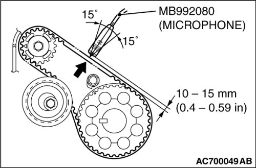Refer to auto-tensioner check Testing and Inspection, for information regarding the vibration frequency measurement method using special tool MB992080.