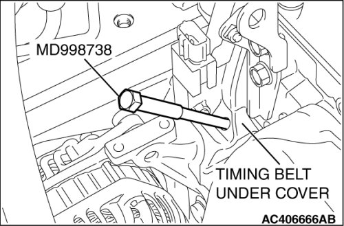 3. Screw in special tool MD998738 by hand until it contacts the timing belt tensioner arm.