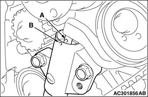 Gradually screw in special tool MD998738 and then align the timing belt tensioner adjuster rod set hole A with the timing belt tensioner adjuster cylinder set hole B.
