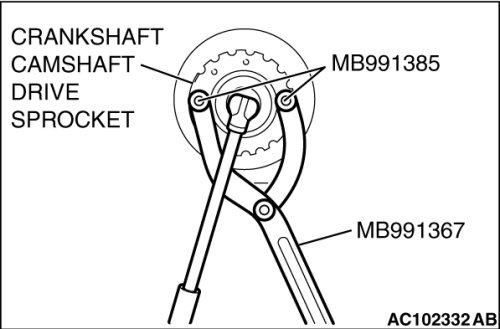 1. Hold the crankshaft camshaft drive sprocket with special tools MB991367 and MB991385.