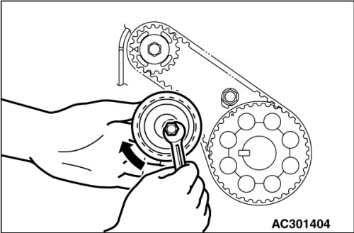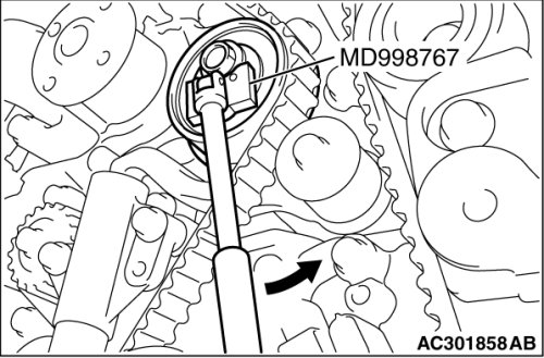 4. Turn the timing belt tensioner pulley in the direction shown in the figure using special tool MD998767 to apply tension to the valve timing belt. Then temporarily tighten and fix the timing belt tensioner pulley mounting bolt.