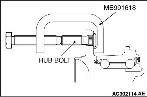 3. Install the plain washer to the new hub bolt, and install the bolt with a nut while holding the hub with special tool MB990767.