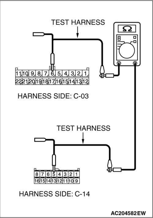 STEP 2. Check the CAN bus lines between joint connector (3) C-03 and the A/C-ECU. Measure the resistance between joint connector (3) C-03 and A/C-ECU connector C-14 [manual air conditioning system] or C-15 [automatic air conditioning system].