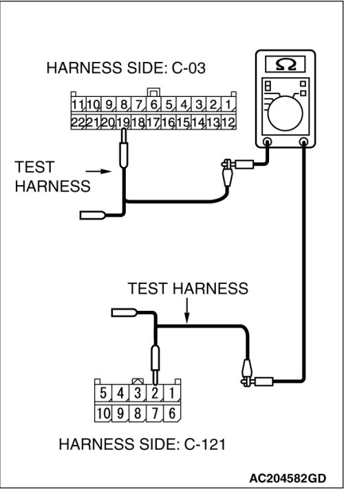 (2)Disconnect joint connector (3) C-03 and TPMS receiver connector C-121, and measure the resistance between the wiring harness side connector of TPMS receiver connector C-121 and joint connector (3) C-03.