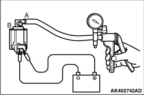 3. Connect a hand vacuum pump to nipple (A) of the EVAP purge solenoid (refer to the illustration at left).
