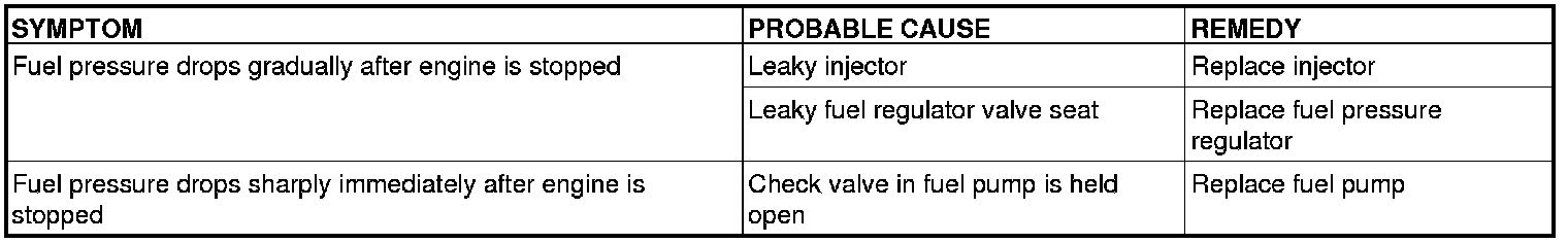 14. Stop the engine and observe fuel pressure gauge reading. It is normal if the reading does not drop within two minutes. If it does, observe the rate of drop and troubleshoot and repair according to the table below. Start, then stop the engine.